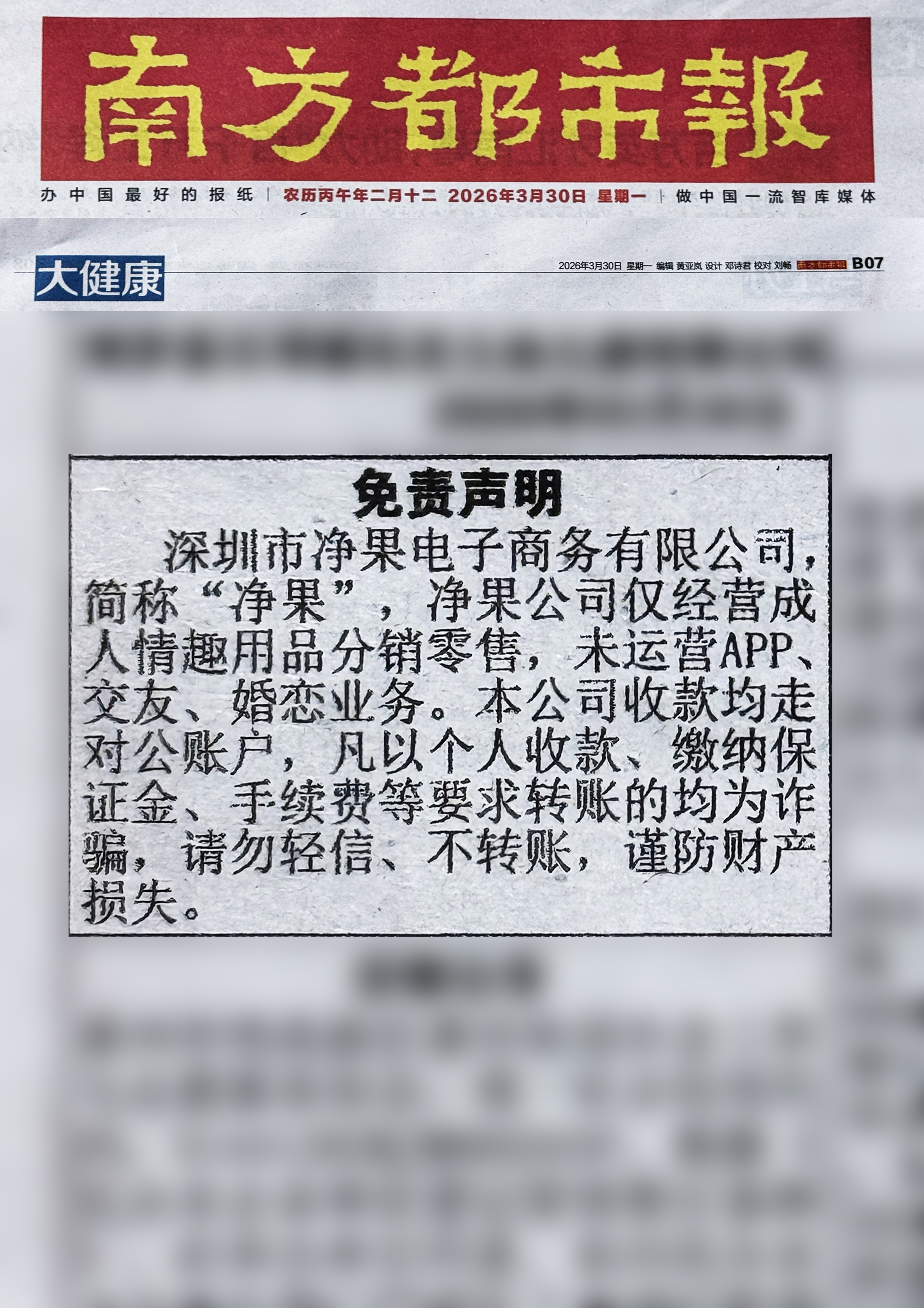 净果免责声明已经登报,南方都市报(农历丙午年二月十二 2026年3月30日星期一),B07版面